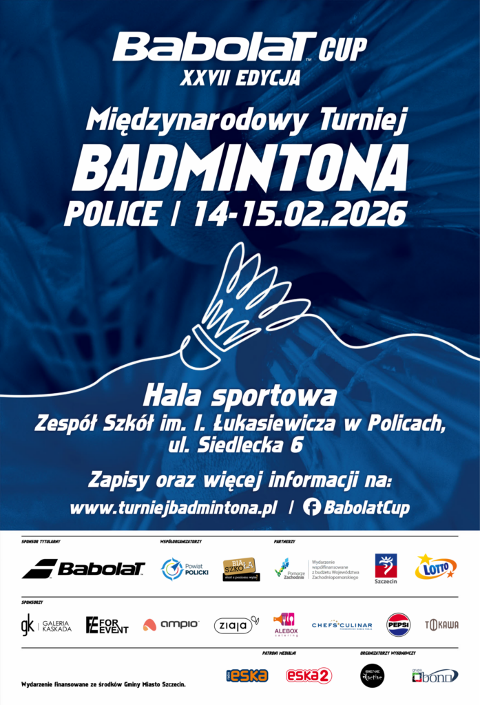 W dniach 14–15 lutego 2026 roku w Police, w Hali Sportowej Zespołu Szkół im. Ignacego Łukasiewicza przy ul. Siedleckiej 6, rozegrany zostanie 27. Międzynarodowy Turniej Badmintona BABOLAT CUP 2026. To prestiżowe wydarzenie od lat przyciąga miłośników badmintona – zarówno ambitnych amatorów, jak i doświadczonych zawodników, którzy chcą sprawdzić swoje umiejętności w sportowej rywalizacji na wysokim poziomie.