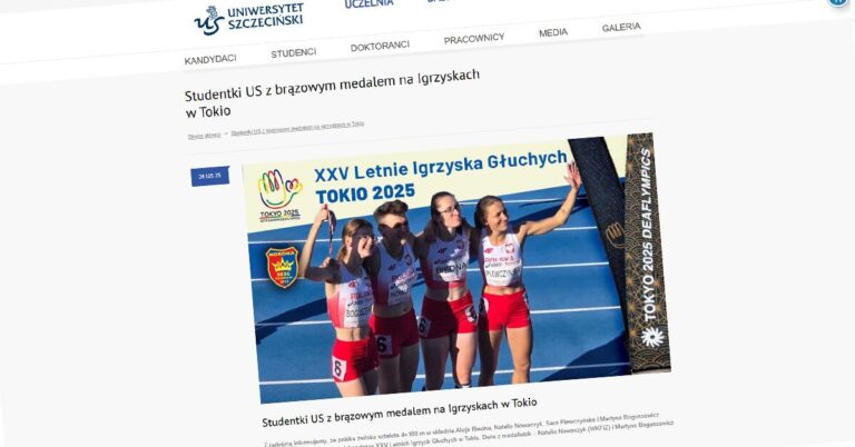 Z radością informujemy, że polska żeńska sztafeta 4×100 m w składzie Alicja Biedna, Natalia Nowaczyk, Sara Plewczyńska i Martyna Boguszewicz wywalczyła dziś brązowy medal podczas XXV Letnich Igrzysk Głuchych w Tokio. Dwie z medalistek – Natalia Nowaczyk (WKFiZ) i Martyna Boguszewicz (WEFiZ) – są studentkami Uniwersytetu Szczecińskiego.